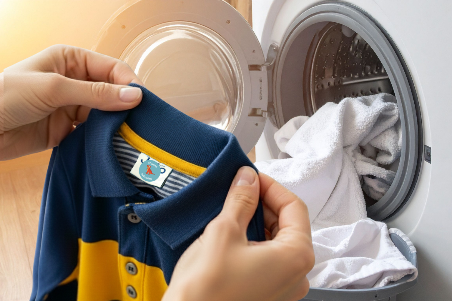 Nimitarrat kiinnitetään helposti painamalla ne suoraan pesuohjelapussa olevaan tasaiseen pintaan. Tarrat tarttuvat parhaiten kuivalle ja puhtaalle pinnalle – ilman silitystä tai ompelua.